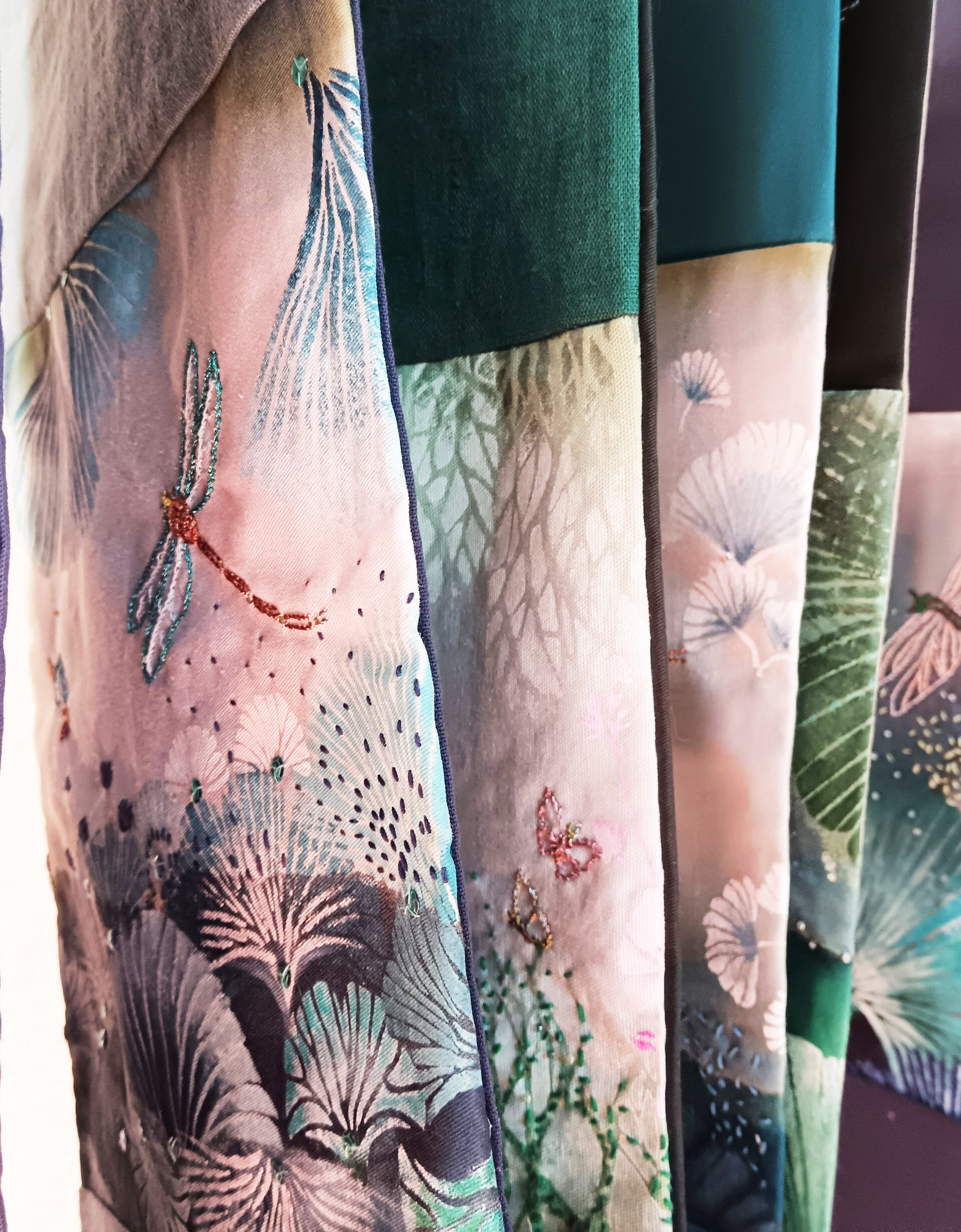 J’ai fondé l’atelier Thétis au printemps 2023 afin de proposer à ma clientèle une collection de panneaux textiles et de kakémonos peints et brodés à la main, liant subtilement l'art et l'artisanat. Fidèle à ma rencontre avec le travail du textile, l'impression et la sérigraphie depuis 2004 lors de ma formation dans l'école Duperré et les Arts Décoratifs de Paris, j’ai décidé de donner vie à mes sources d’inspiration que sont la nature, la faune et la flore sur le tissu, matériau naturel, souple et modulable. Les graphismes s’animent au gré des encres lumineuses dans un esprit japonisant et ornemental, pour la décoration intérieure.